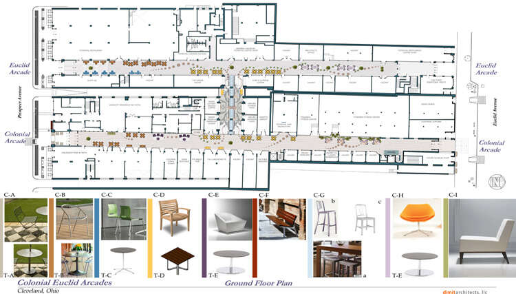 Sidewalk cafe seating was introduced to make the exterior zones on Euclid and Prospect Avenues more inviting. The new seating worked in conjunction with new exterior landscaping, railings, lighting and awnings to increase foot traffic in the busy downtown location.