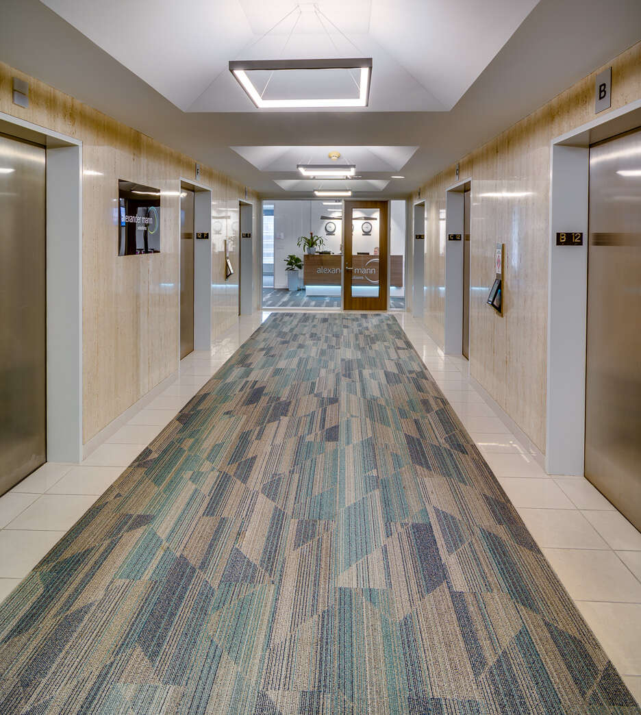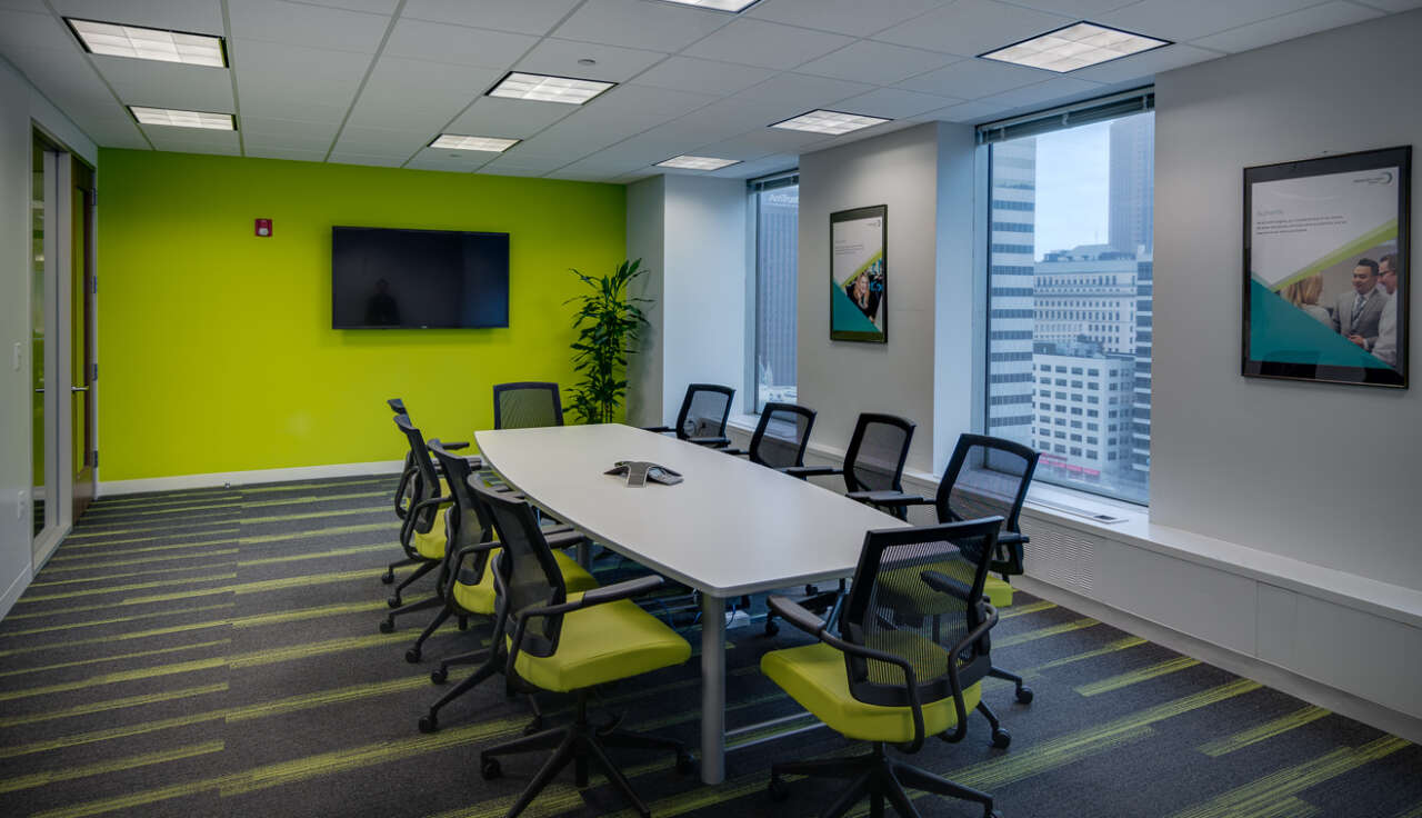 New carpet and paint in Alexander Mann’s corporate colors were provided throughout to add cohesion and a fresh look. Additional improvements included a wellness room, coat closets repurposed from less functional recesses, and a shared touch-down / visitor work area. It was essential to apply the budget strategically to yield the maximum impact.