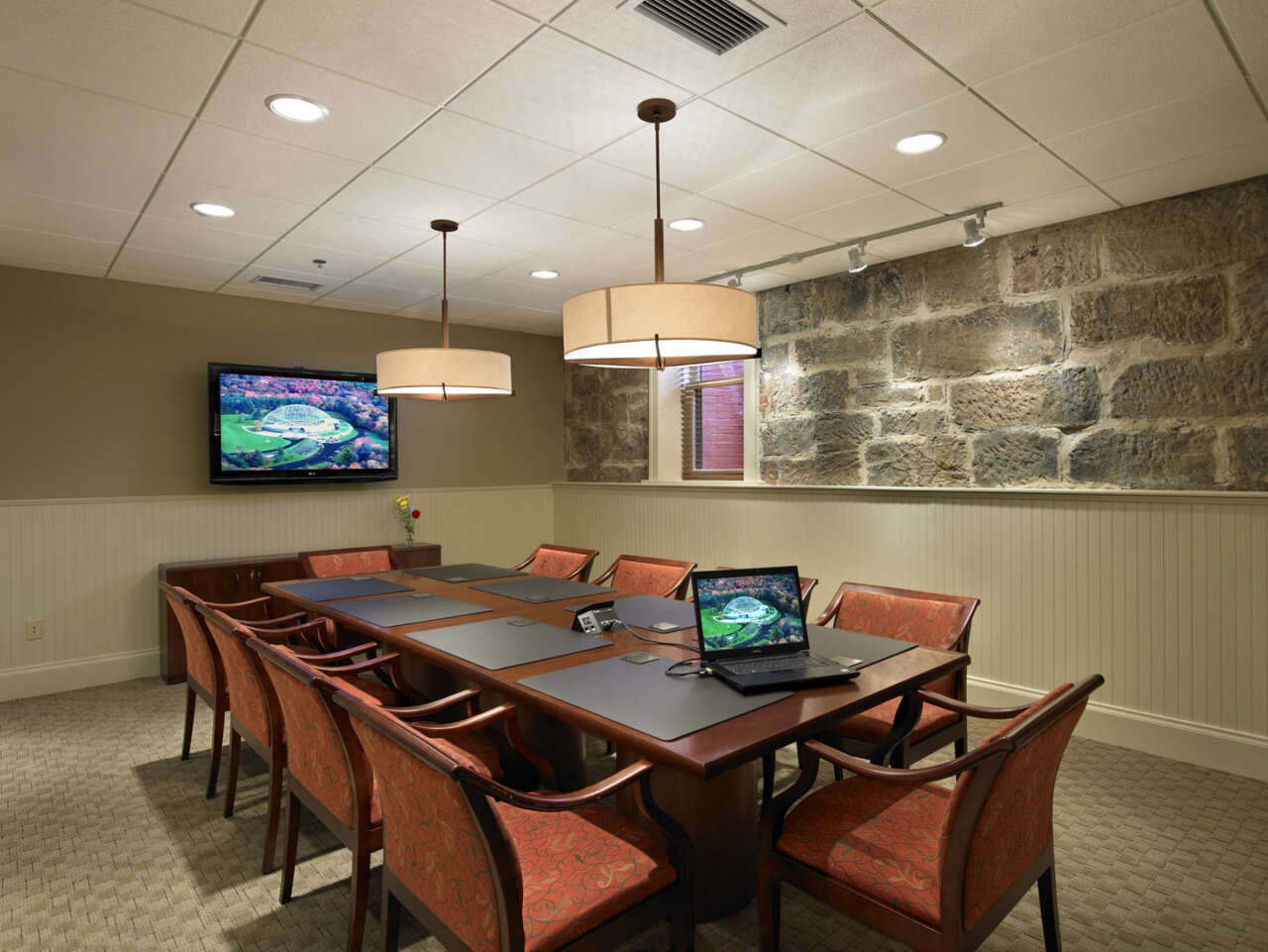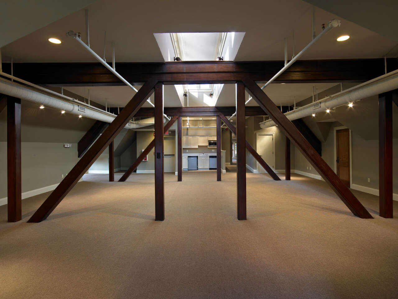 The original Odd Fellows Hall at Andrew Jackson House was converted into an elegant multi-use meeting space which facilitates executive conference gatherings, panel board, and ballroom events with a capacity of 120 persons. The existing paneled walls and elaborate cove moldings were restored and a new open stair was added to connect the grand space with the rest of the GAR Foundation executive offices.