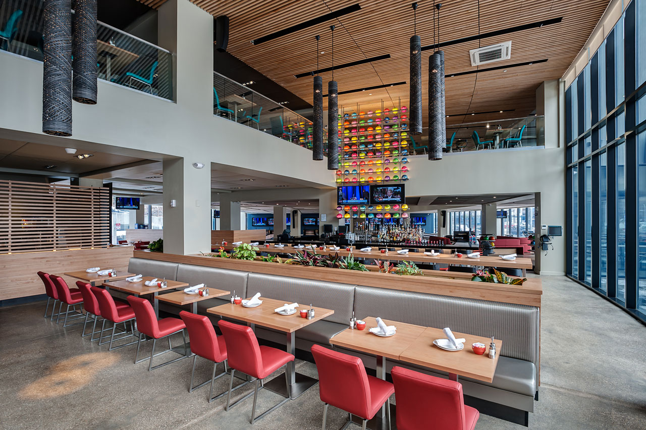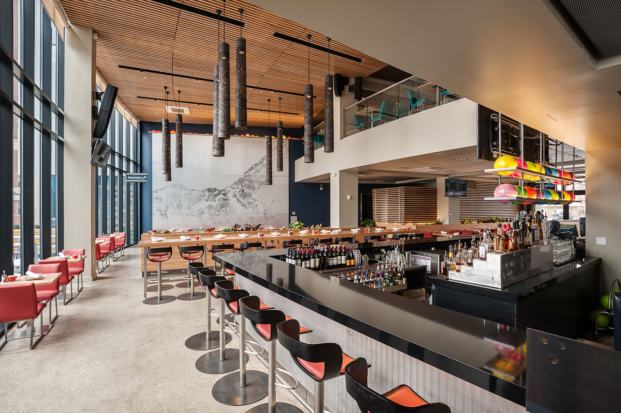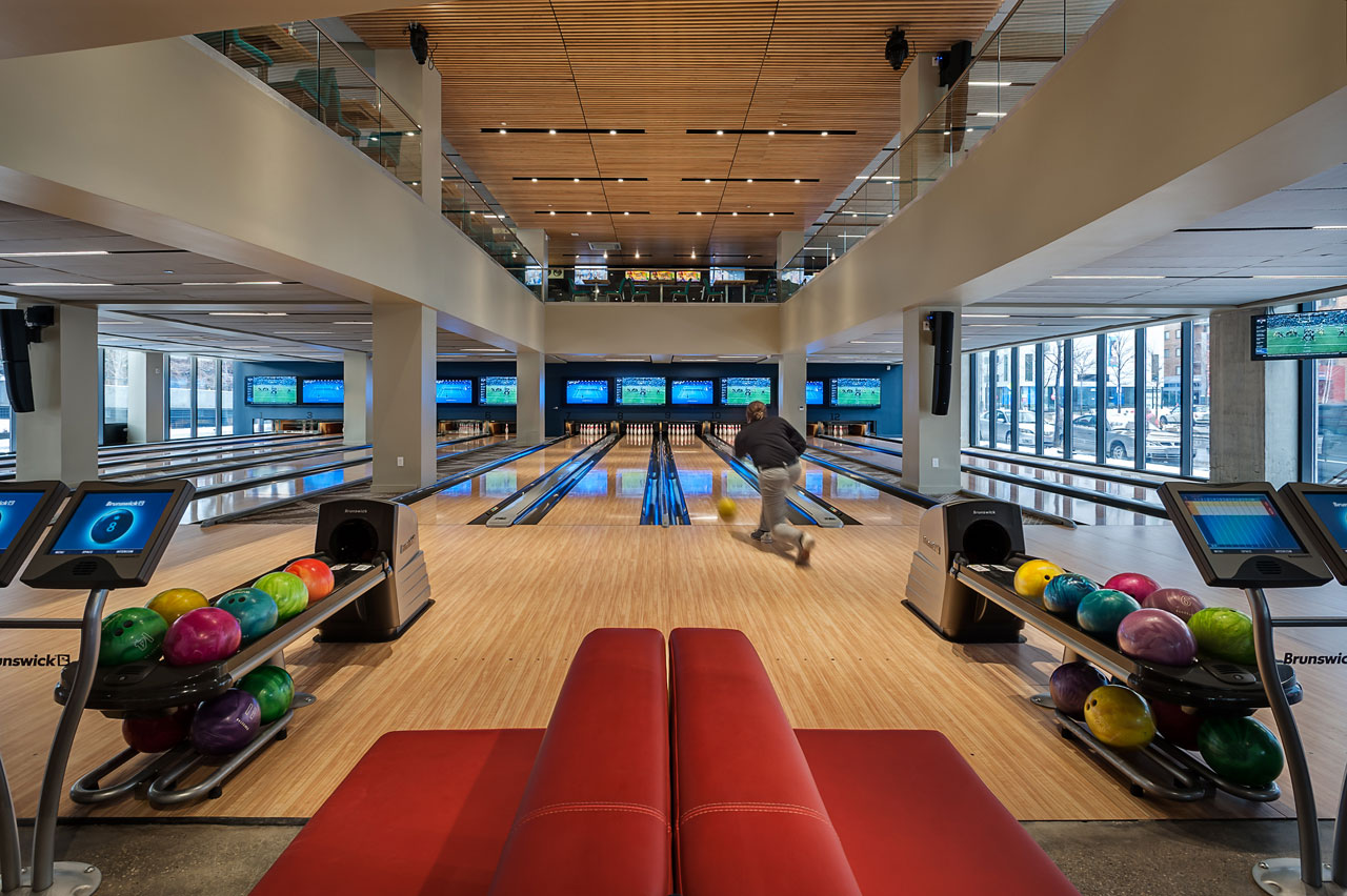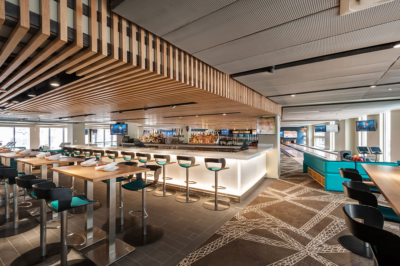 Anchoring the Uptown Mixed-use Development in University Circle’s vibrant arts and entertainment district, this popular sports bar/ restaurant/bowling alley represents the second successful location of the brand venue when completed in December 2014. Seventeen bowling lanes are available in the 23,000 s.f. space, which showcase the typical bowling experience in a more modern and urban atmosphere. Private parties are facilitated in a special elevated lane mezzanine above, where patrons can lounge directly along the lanes and overlook the action on both floors. A feature wall of 99 colorful acrylic balls suspended in steel plate spans the double-height bar and dining room that looks onto bustling Euclid Avenue and the new Museum of Contemporary Art just across the street.