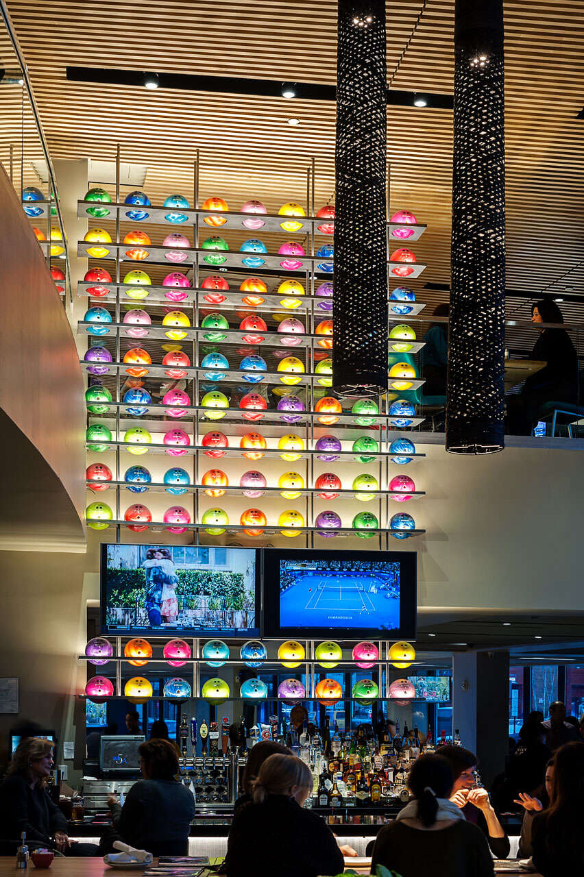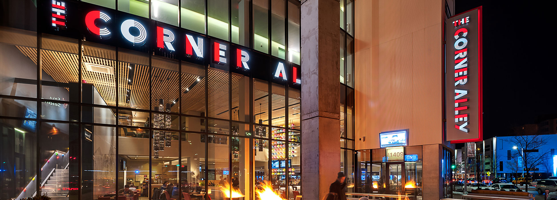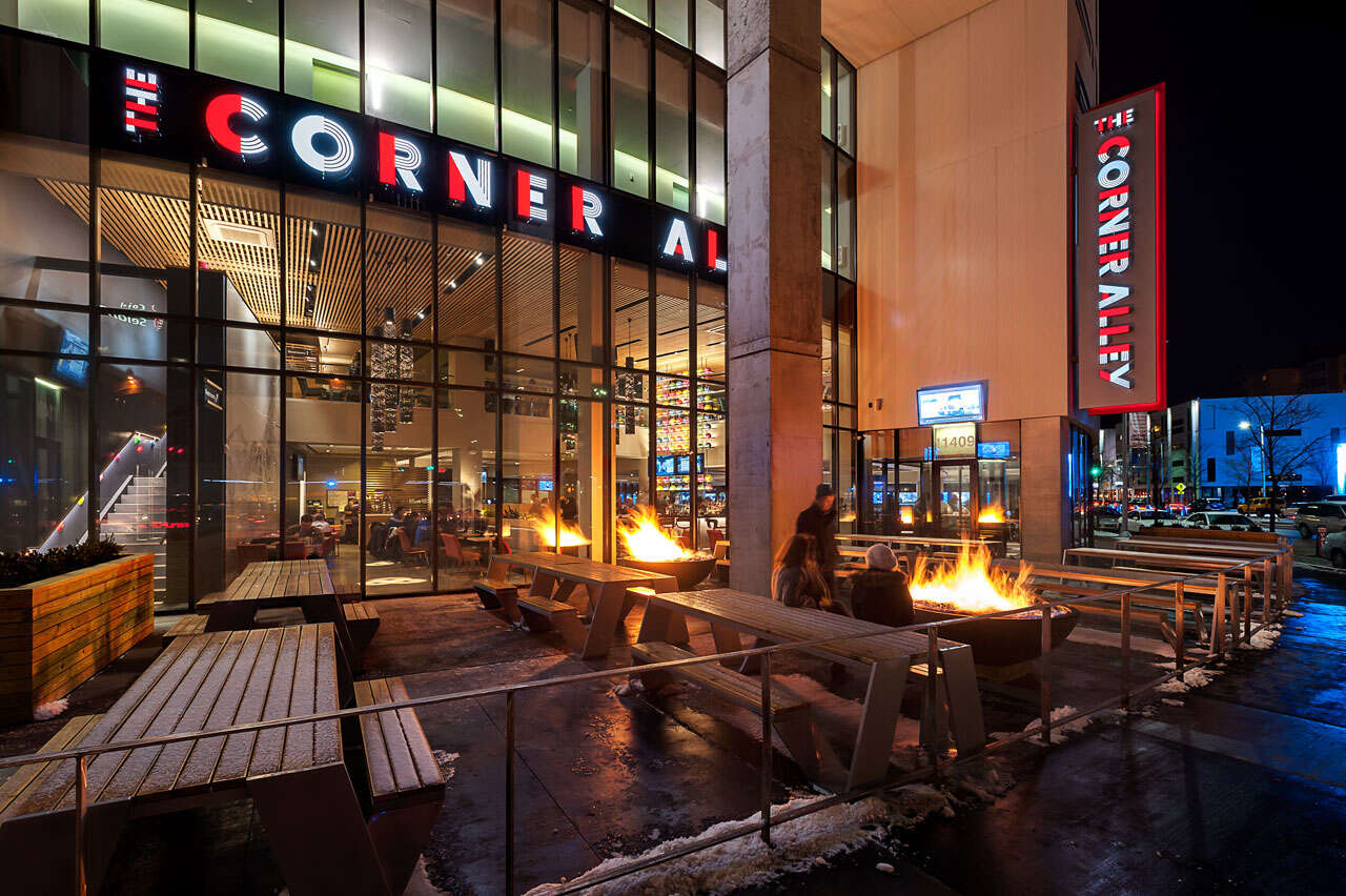 Anchoring the Uptown Mixed-use Development in University Circle’s vibrant arts and entertainment district, this popular sports bar/ restaurant/bowling alley represents the second successful location of the brand venue when completed in December 2014. Seventeen bowling lanes are available in the 23,000 s.f. space, which showcase the typical bowling experience in a more modern and urban atmosphere. Private parties are facilitated in a special elevated lane mezzanine above, where patrons can lounge directly along the lanes and overlook the action on both floors. A feature wall of 99 colorful acrylic balls suspended in steel plate spans the double-height bar and dining room that looks onto bustling Euclid Avenue and the new Museum of Contemporary Art just across the street.