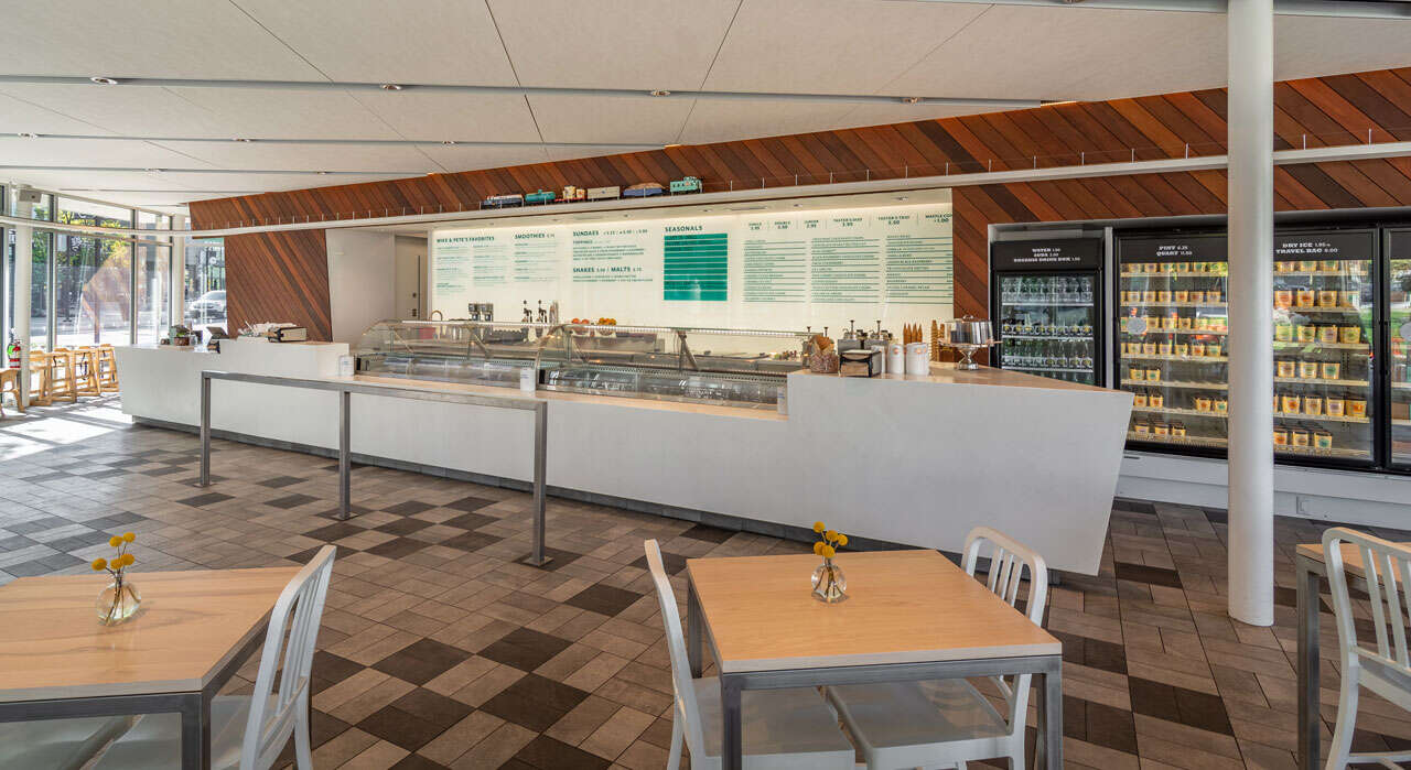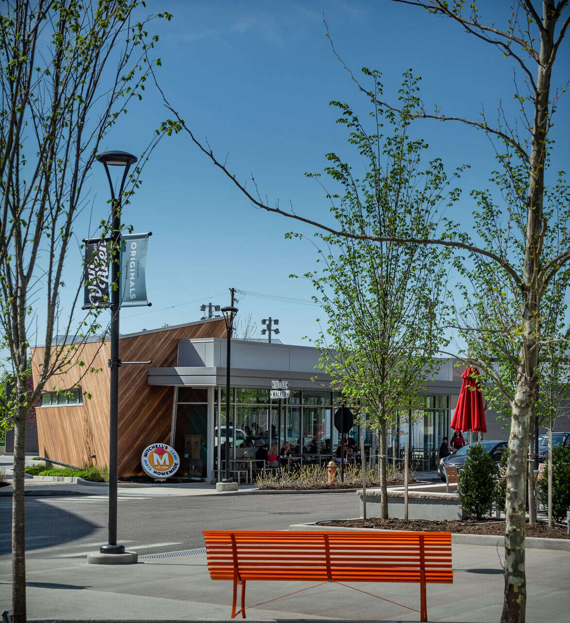 Mitchell’s Homemade Ice Cream is located in the central “living room” of the mixed-use Van Aken District in Shaker Heights. Designed as a pavilion in a park plaza setting, this 2,345 square foot restaurant opens to its surroundings with glass facades and generous canopies for outdoor seating and community gathering.