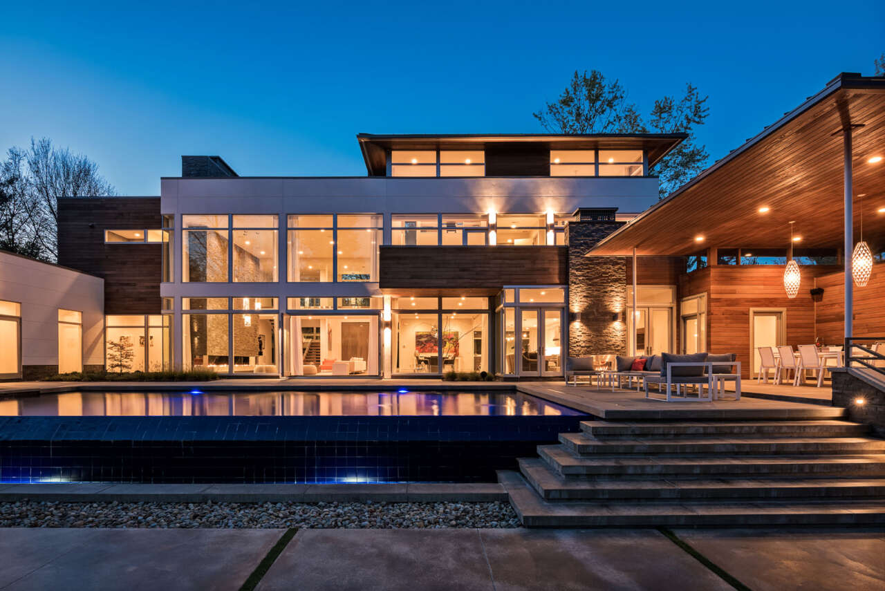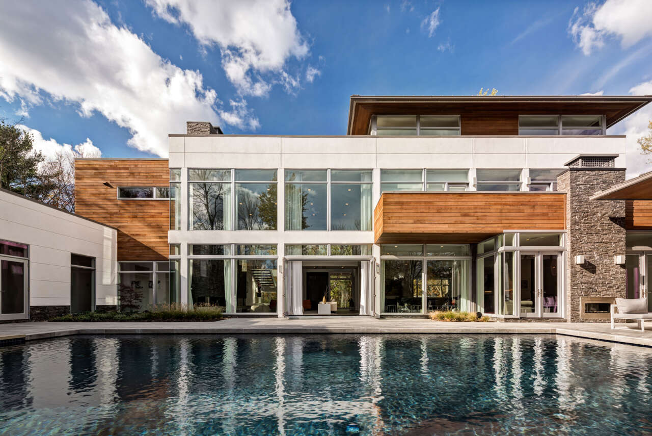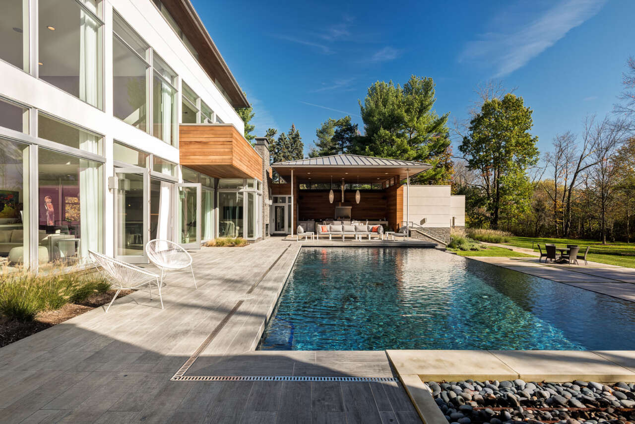 The home is massed about an exterior courtyard featuring a generous pool and outdoor living room with kitchen. Large folding and French patio doors coupled with double-story windows open onto the courtyard, achieving a strong indoor-outdoor connection.
