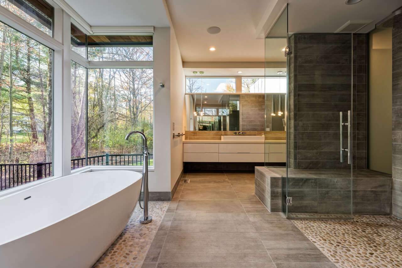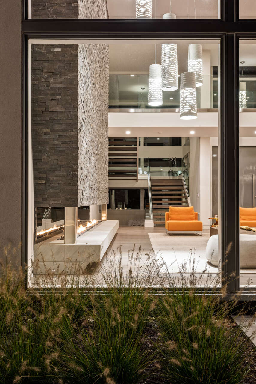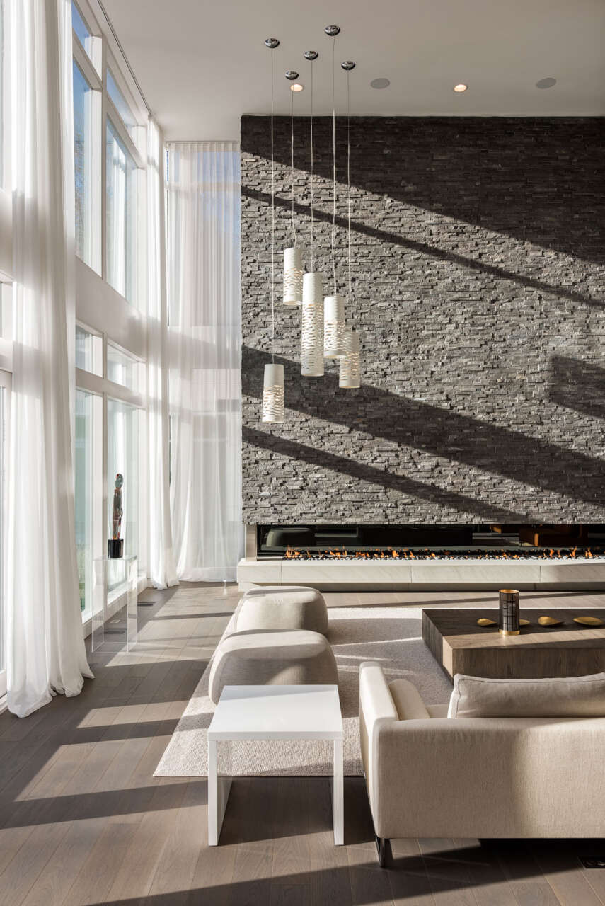 The family loves to entertain and requested that the home have an easy flow between spaces. Gathering areas include a sixteen-foot thin-slab porcelain kitchen island and a living room featuring a two-story, twenty-foot wide linear fireplace with stone masonry. Vibrant art pops against the clean, modern finishes.