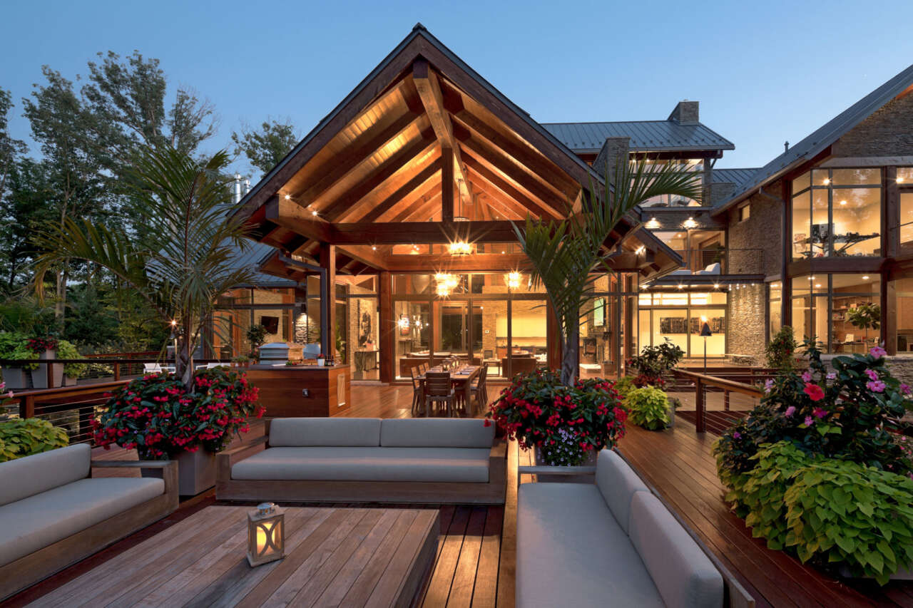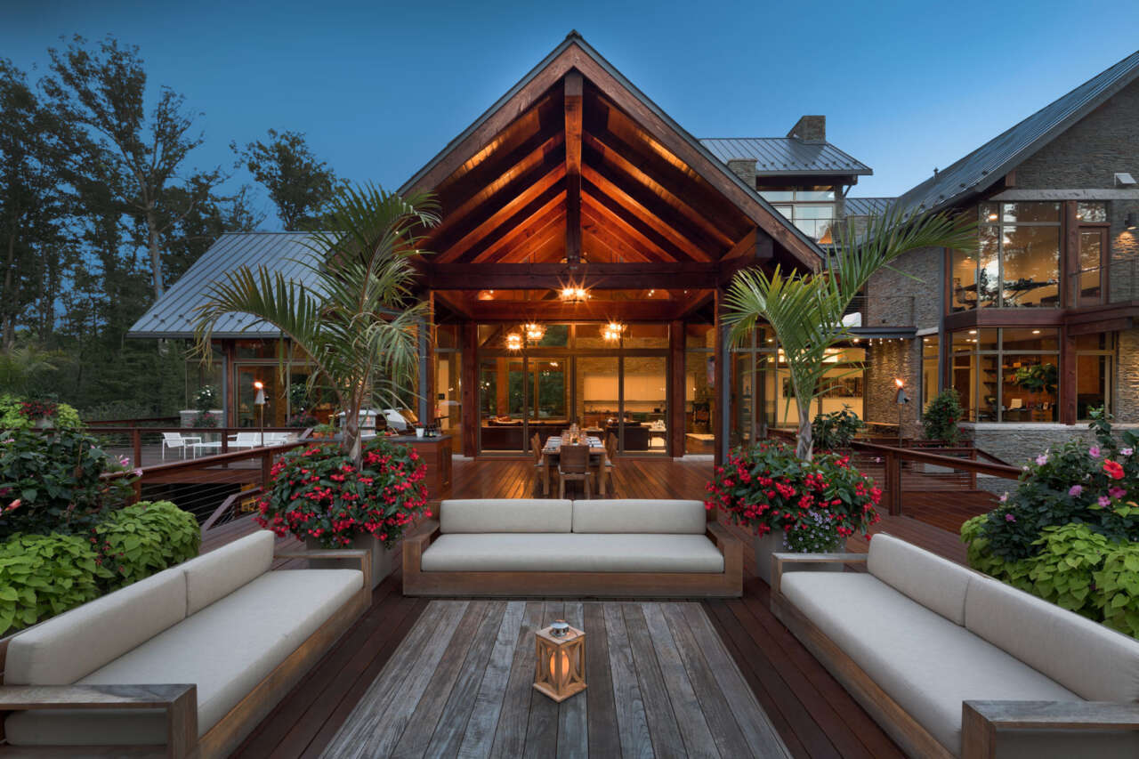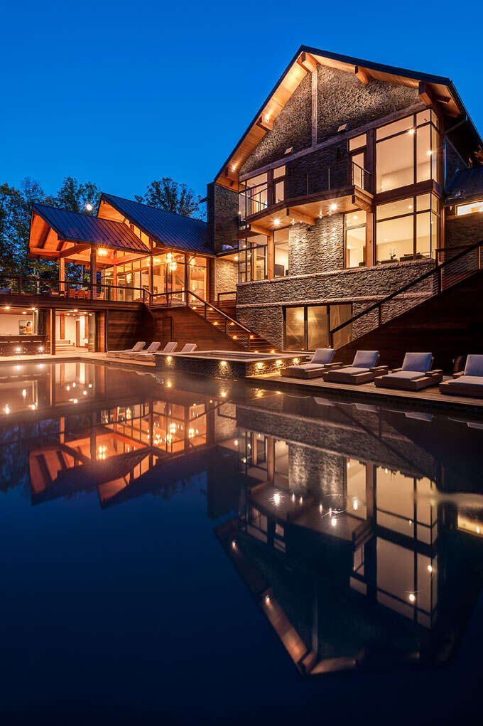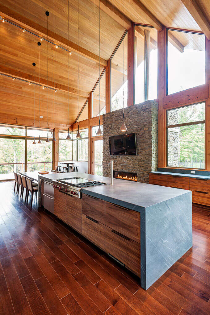 The heavy timber framing of the home was fabricated by local Amish craftsmen of solid Douglas fir, while the majority of exterior facades are clad in locally-sourced limestone set in a dry-stack manner. Payne & Payne Builders constructed the residence, which was completed in 2016.