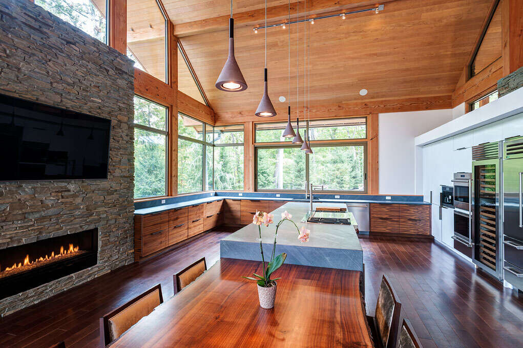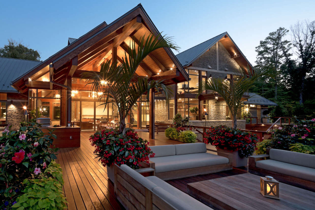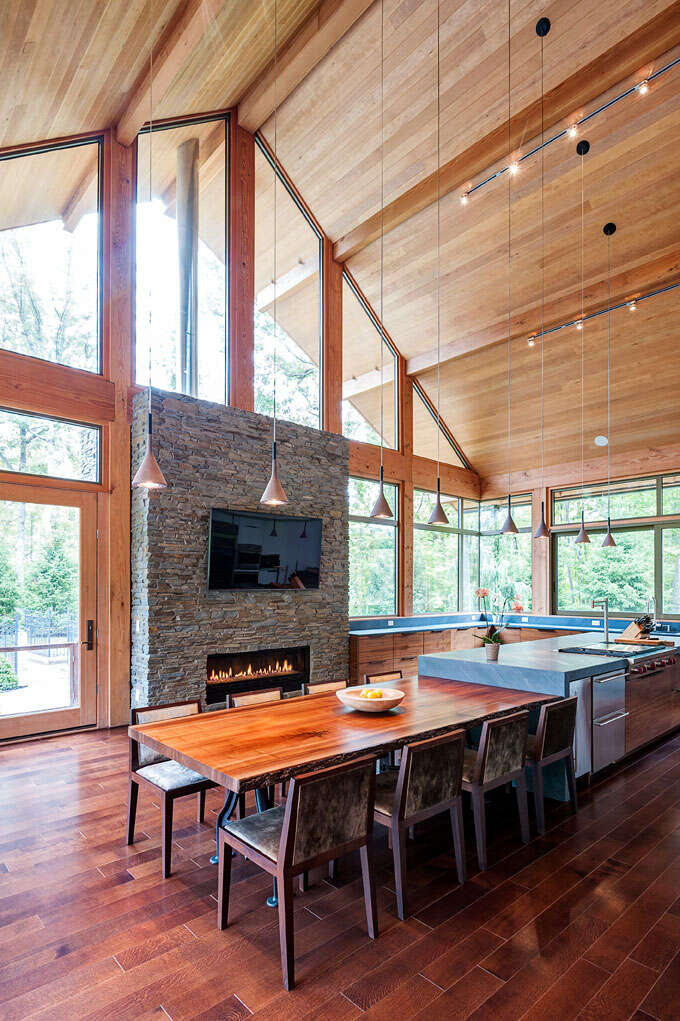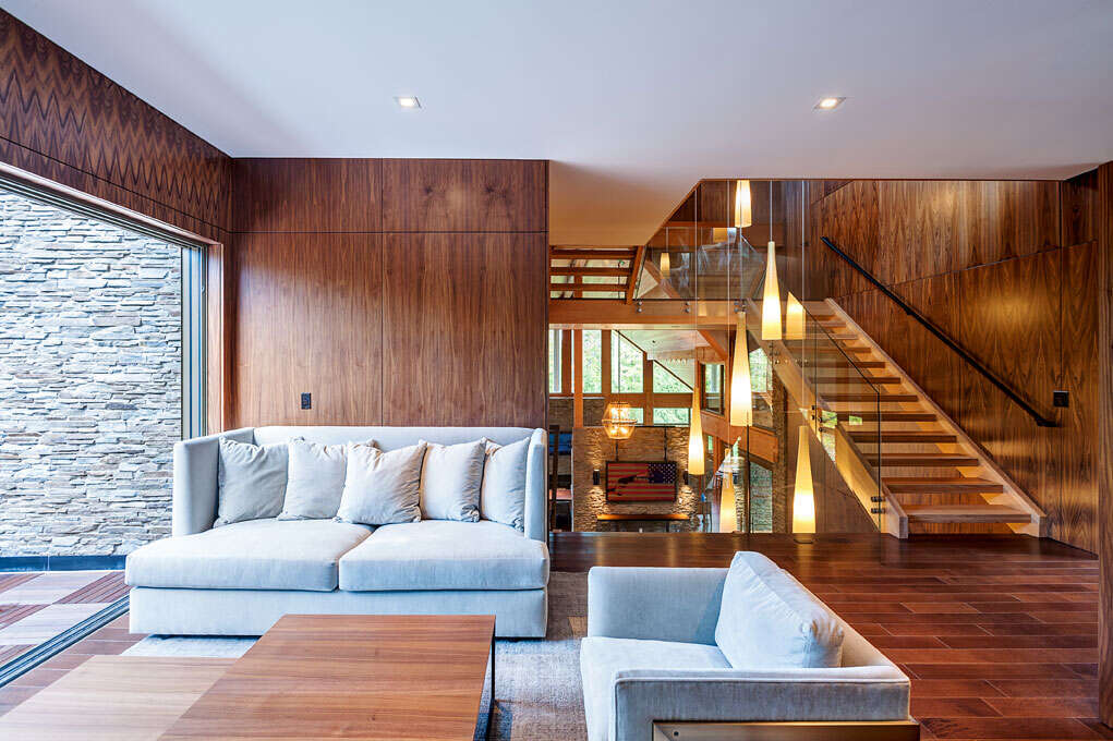 The heavy timber framing of the home was fabricated by local Amish craftsmen of solid Douglas fir, while the majority of exterior facades are clad in locally-sourced limestone set in a dry-stack manner. Payne & Payne Builders constructed the residence, which was completed in 2016.