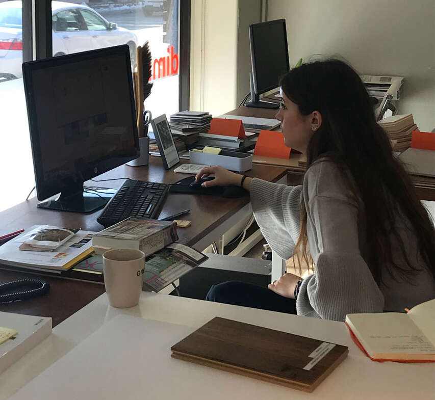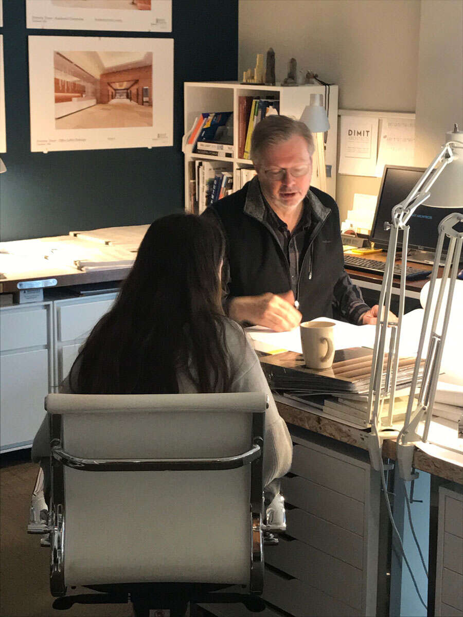 As a project sponsor, Dimit Architects hosted Elizabeth for three days and taught her about the design process. She received hands-on experience by creating a material board and drawing her room in AutoCAD. Team members took her to several job sites, where she learned a bit about the construction administration process.
