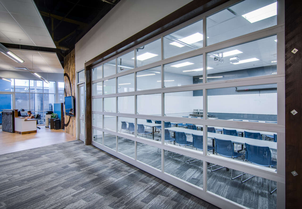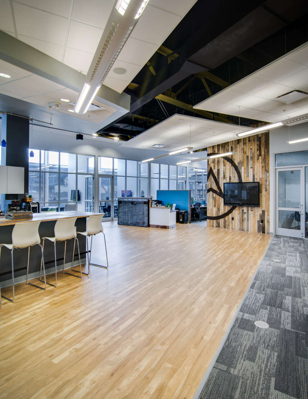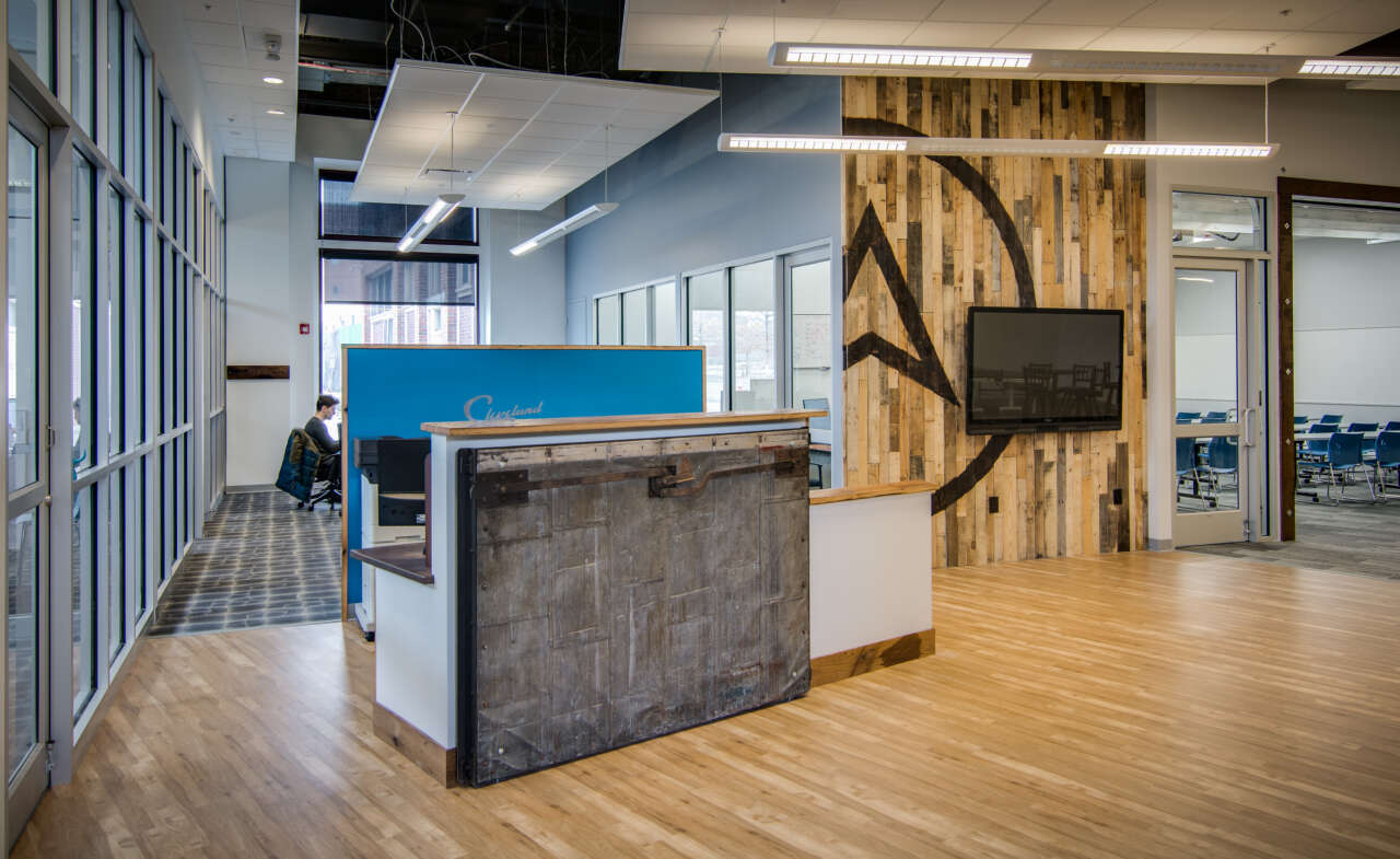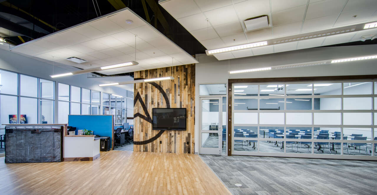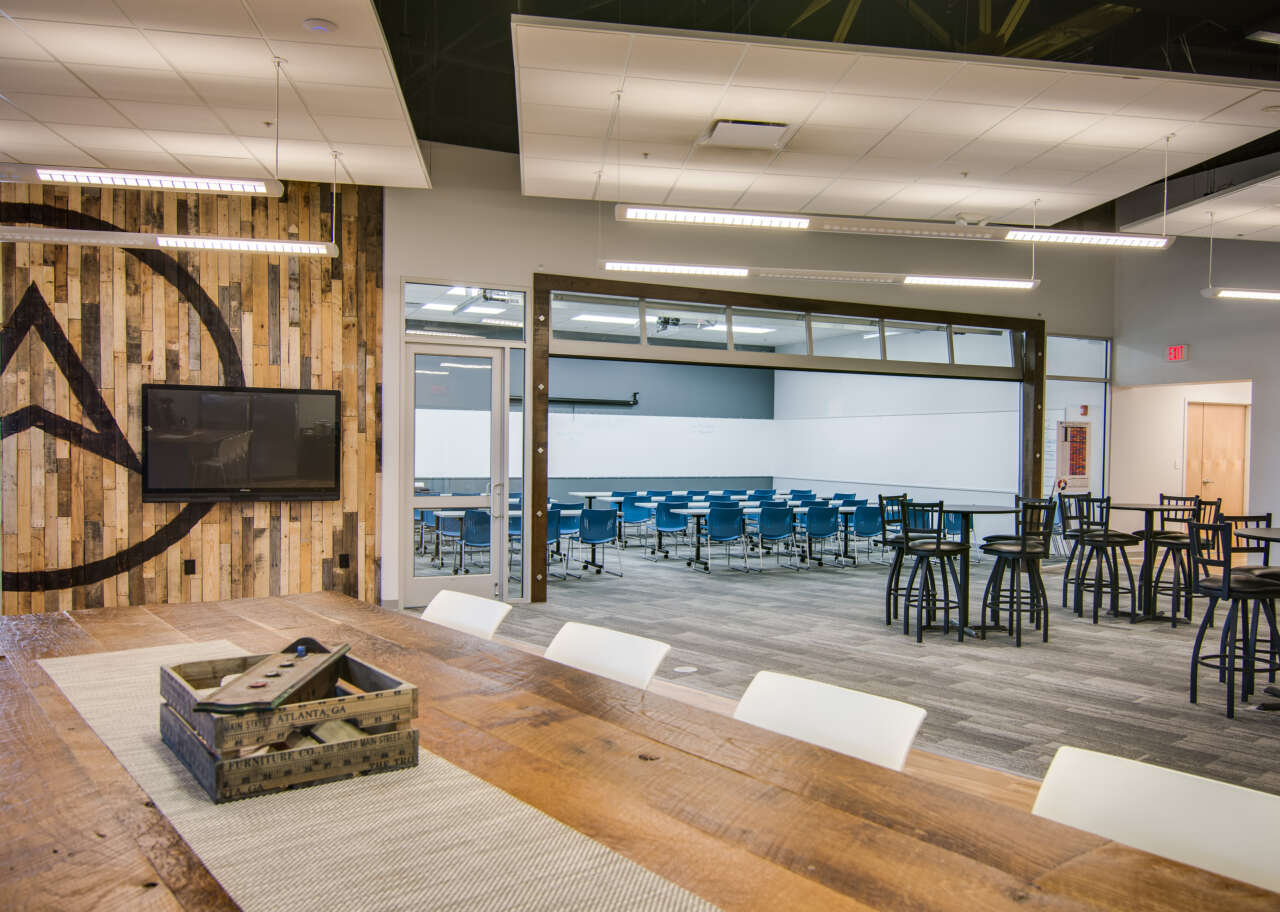 The floor plan of Tech Elevator was designed to maximize flexibility. The space had to be able to host students, office staff and regular graduation ceremonies. A new multi-purpose classroom area was added, as well as revamped kitchen, conference and office amenities. A reclaimed wood wall featuring the Tech Elevator logo, and new reception area were created to add warmth to the space while complementing the technically focused learning areas.